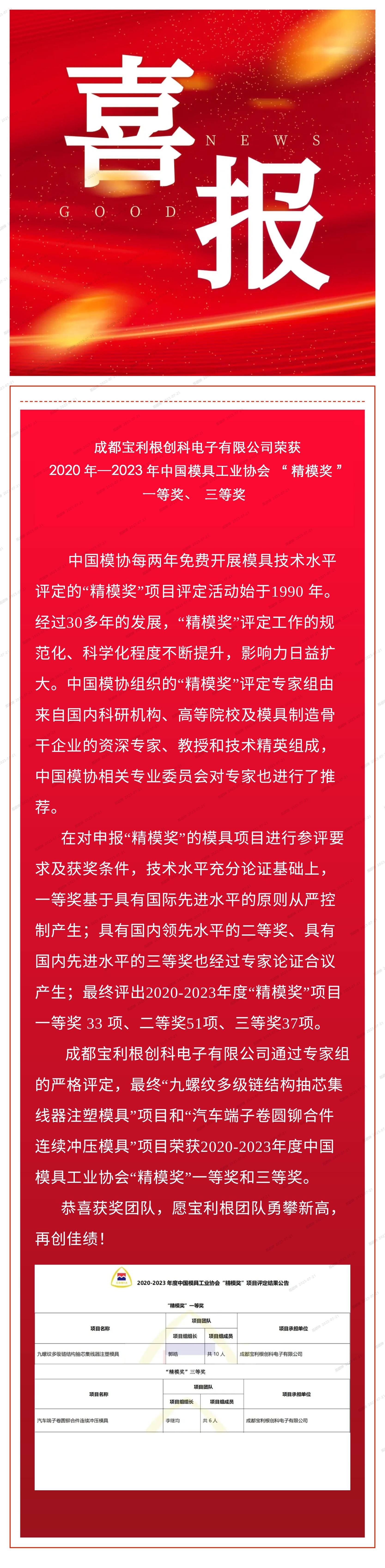 喜报——成都金年会创科电子有限公司荣获 2020年—2023年“精模奖”一等奖、三等奖